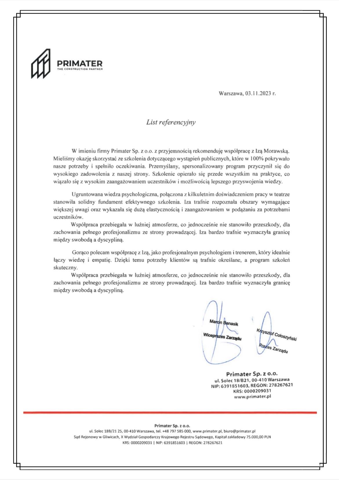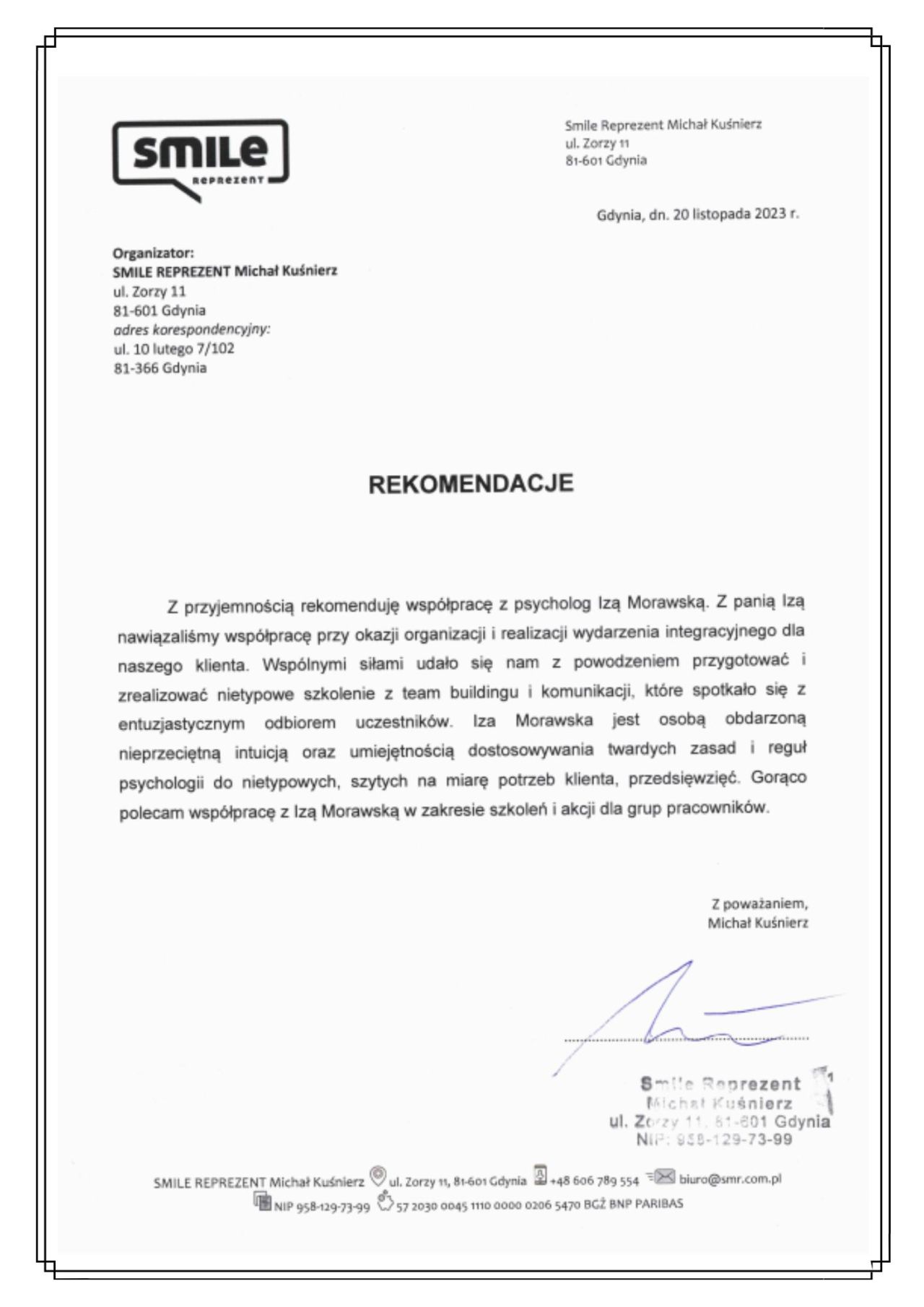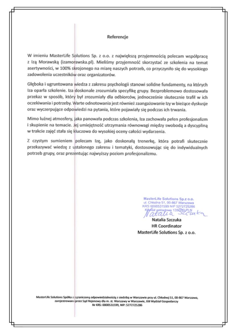 z życzliwością i empatią, pokazując, że skuteczna komunikacja nie musi być ani twarda, ani chłodna. Prowadzę szkolenia, w których teorię przekładam na realne przykłady z życia i pracy – dzięki temu uczestnicy otrzymują konkretne narzędzia i techniki, które mogą zastosować od razu w codziennej praktyce. Prowadzę także prywatny gabinet psychologiczny oraz dzielę się wiedzą w mediach społecznościowych, aby wspierać innych w rozwijaniu umiejętności budowania relacji opartych na zaufaniu, szacunku i autentyczności.